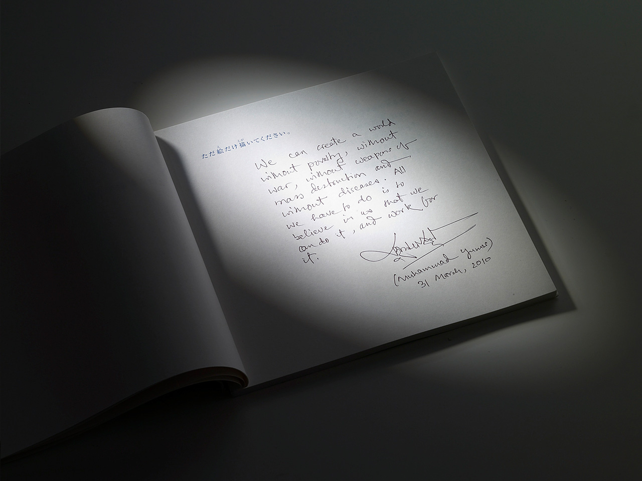 私たちは創り出すことができる。 貧困のない世界、戦争のない世界、 そして核兵器のない世界を。 信じさえすればよい。私たち自身を、 私たちはできるということを。 そして、そのために尽くせばよい。 2006年ノーベル平和賞受賞 グラミン銀行創始者 プロフェッサー ムハマド・ユヌス 2010年3月31日